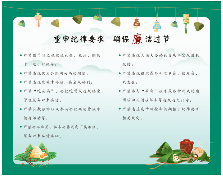 定制廉潔提醒卡。端午廉潔提醒卡內容經(jīng)過精選,融合廉潔提醒、“十個嚴禁”、端午詩詞鑒賞等內容,在品味端午文化的同時,為全體黨員干部職工擰緊紀律“發(fā)條”,確保風清氣正過端午。