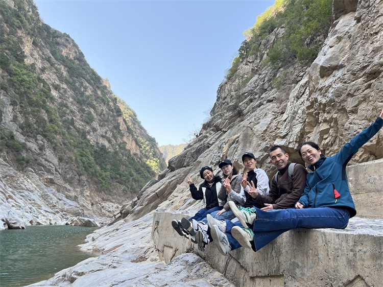 在一路歡聲笑語(yǔ)中,大家到達(dá)了鄭國(guó)渠景區(qū)。沿著山邊步道,拾級(jí)而下,賞春踏青,開(kāi)啟了涇河漫步之旅。山的崎嶇呼應(yīng)著峽的險(xiǎn)峻,水的靈秀映襯著石的詭譎,完美的詮釋了大自然的鬼斧神工。大家行走在棧道隧洞之間,相伴于碧水藍(lán)天之際,工作一周的疲憊已然消散不見(jiàn)。